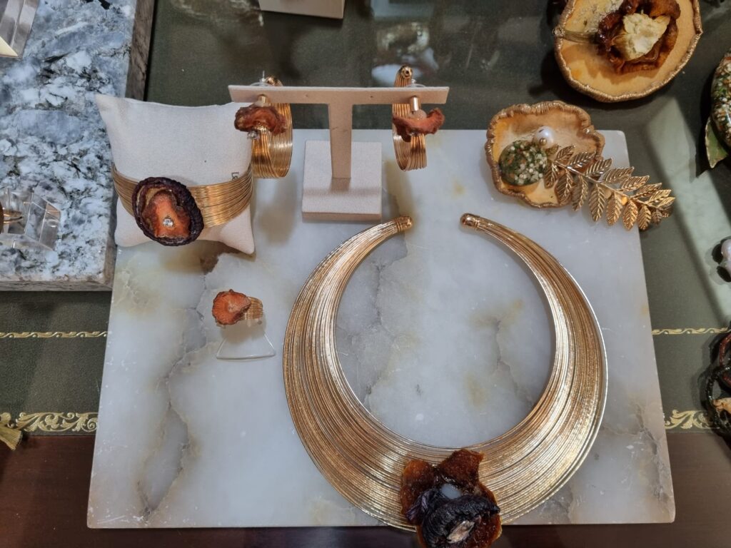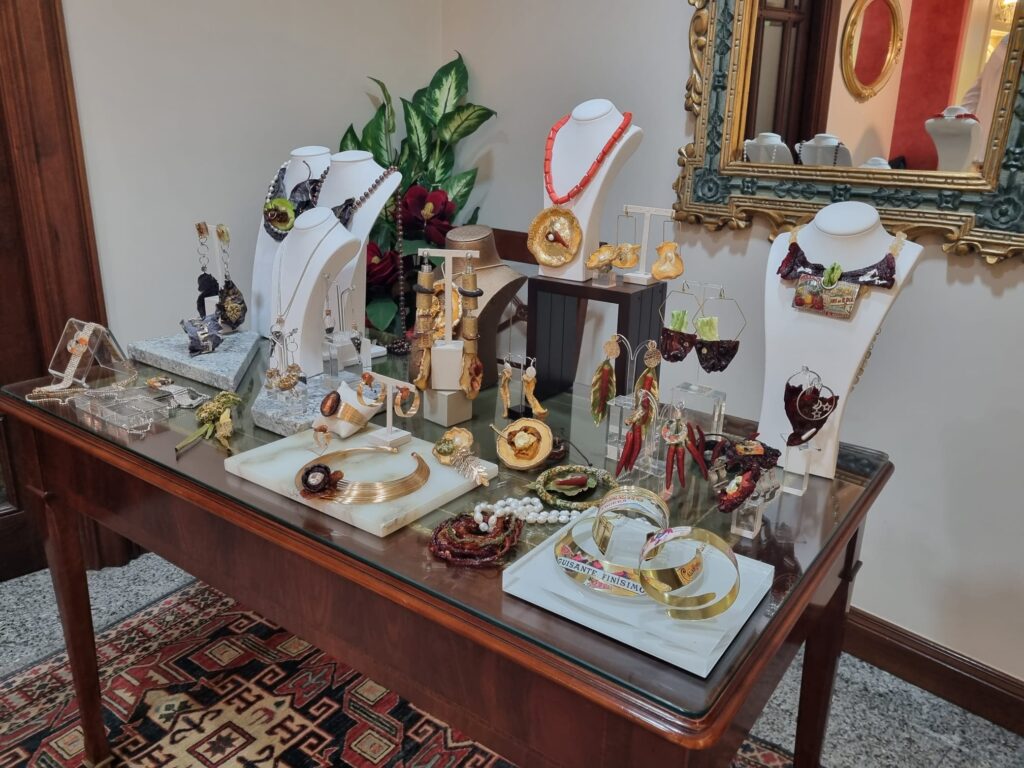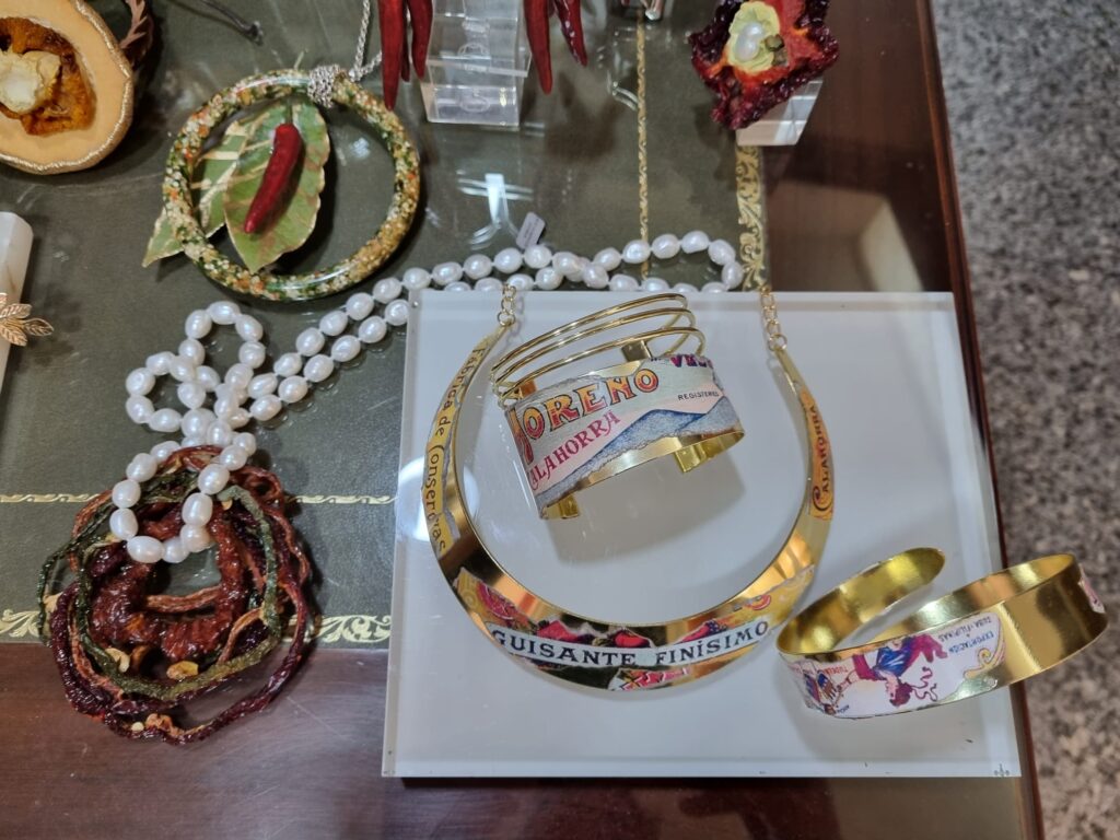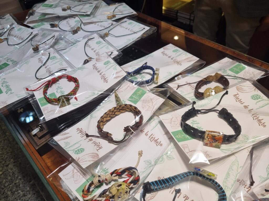 Estarán a disposición del público tanto unos colgantes con semillas y gemas, como unas pulseras con piezas de resina epoxy con juliana de verduras y gemas. Estas piezas tienen un precio francamente accesible.