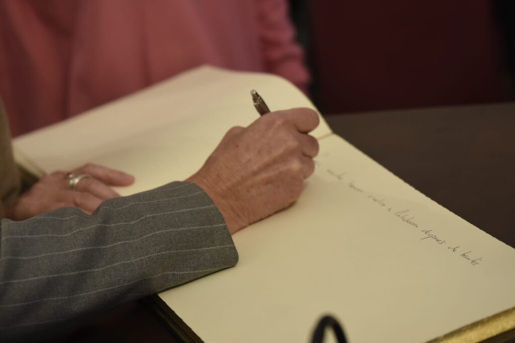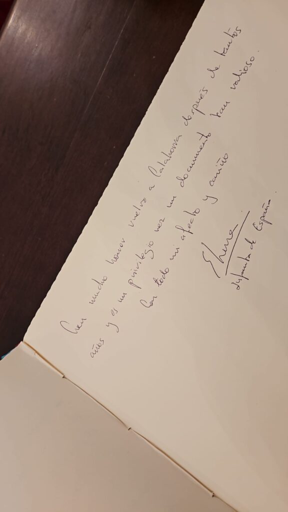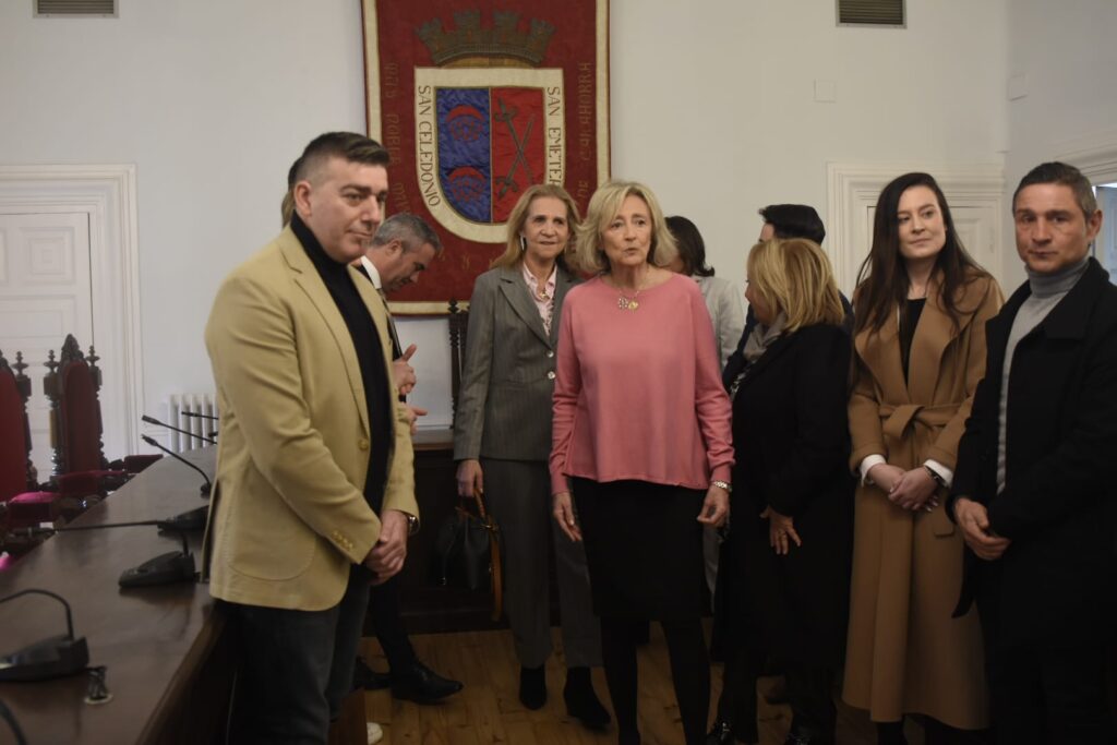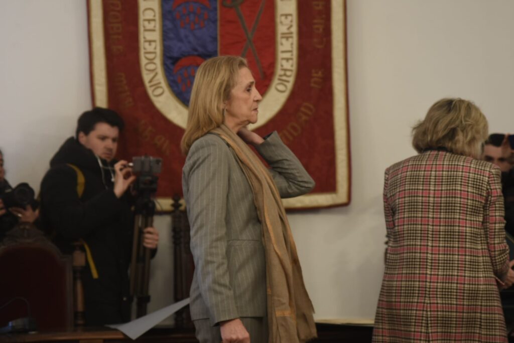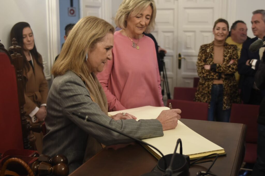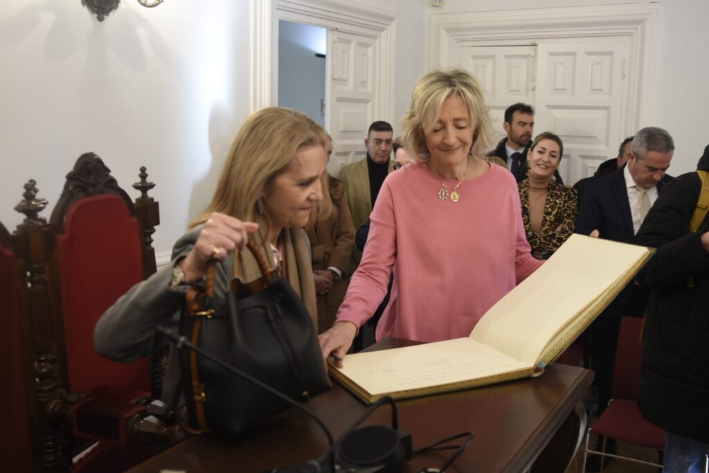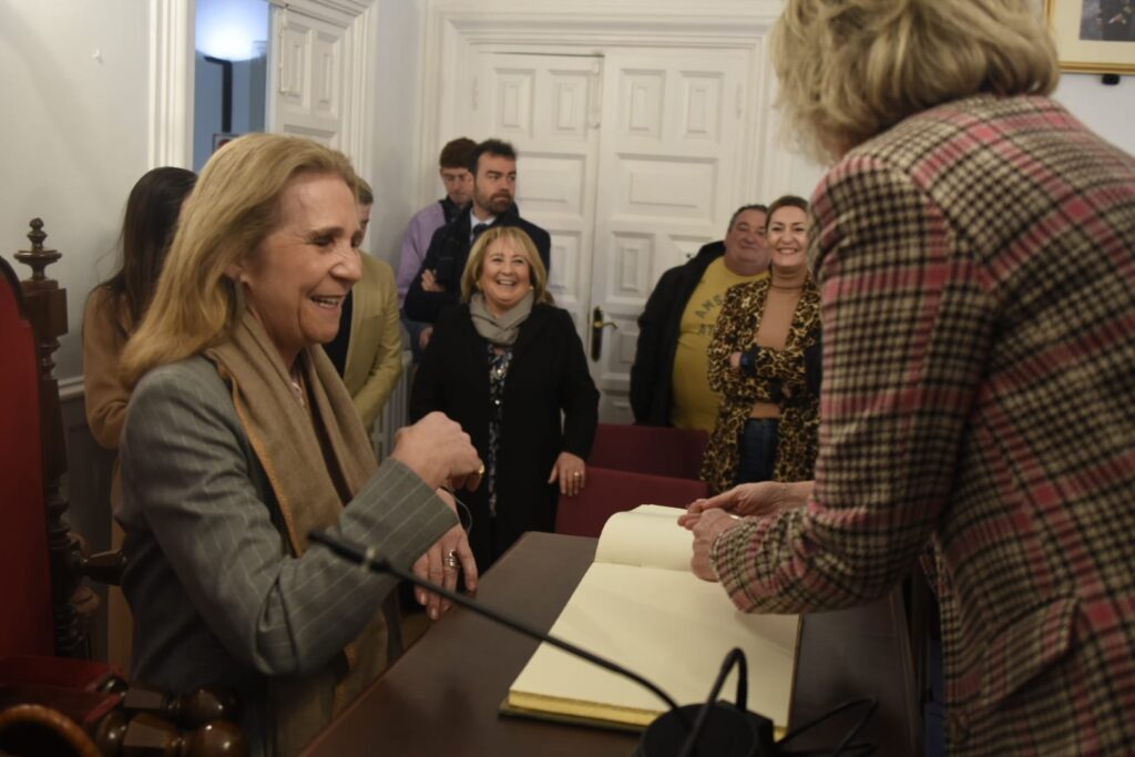 La Infanta Elena ha llegado a Calahorra hace unos minutos y ha sido recibida en el Ayuntamiento por las autoridades locales. Después ha firmado en el libro de honor del Consistorio.