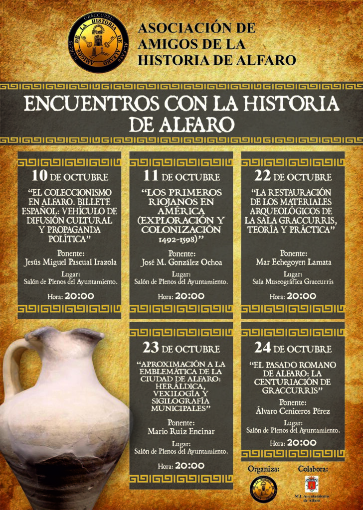 La Asociación Amigos de la Historia de Alfaro presenta las actividades para este mes de octubre, “Encuentros con la Historia de Alfaro”. Son cinco conferencias, con una temática muy variada, y con la novedad de que la conferencia del día 22 se realizara en la sala Museografica Graccurris. Todas comenzaran a las 20:00 horas