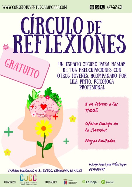 El Consejo de la Juventud Comarcal de Calahorra pone en marcha una nueva iniciativa dirigida a los jóvenes de la comarca: Círculo de Reflexiones. Se trata de un espacio seguro en el que los participantes podrán expresar sus preocupaciones y compartir inquietudes en un ambiente de confianza, acompañados por la psicóloga Lila Pinto.