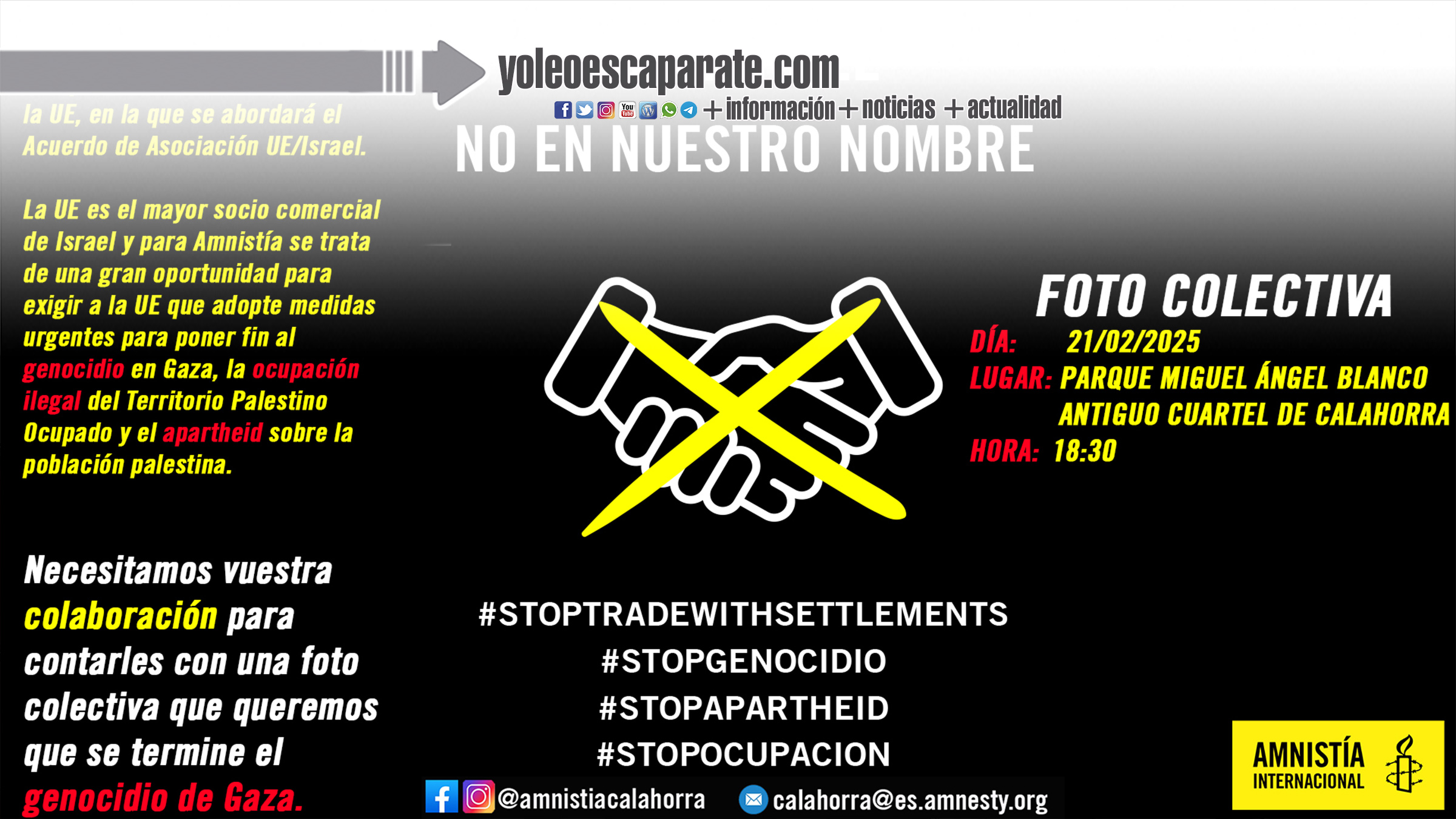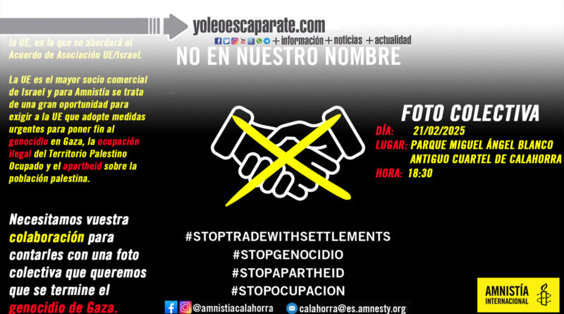 Por ello, Amnistía Internacional está llevando a cabo una acción a nivel nacional para exigir el fin del genocidio y la prohibición del comercio y las inversiones que contribuyen a mantener la ocupación ilegal y el apartheid. En Calahorra, el grupo local de la organización convoca a la ciudadanía a una fotografía colectiva para presionar a los líderes europeos en esta cumbre tan importante. Tendrá lugar el viernes 21 de febrero a las 18:30 en el nuevo parque Miguel Ángel Blanco, en el antiguo cuartel de la Guardia Civil. Tras una exhaustiva investigación, el pasado mes de diciembre Amnistía Internacional denunció en un informe que Israel ha cometido y continúa cometiendo genocidio contra la población palestina de la Franja de Gaza. Y recuerda que los Estados que siguen transfiriendo armas a Israel están incumpliendo su obligación de impedir el genocidio y se arriesgan a ser cómplices del mismo.