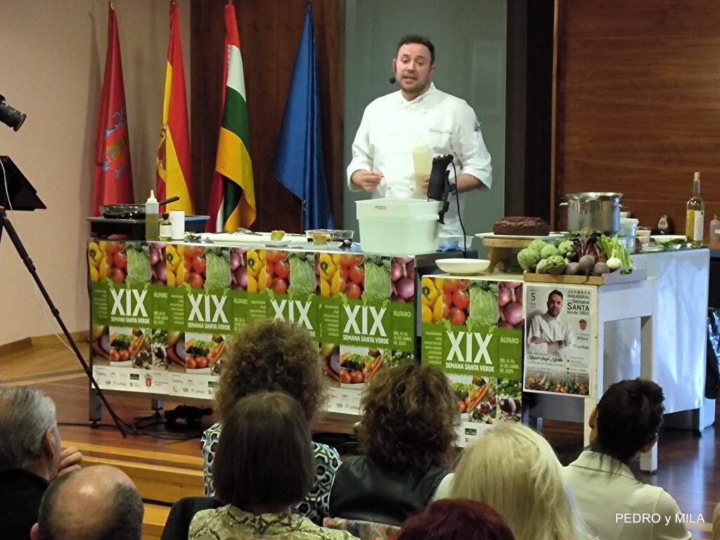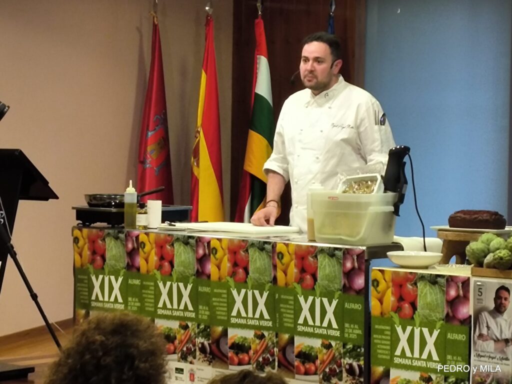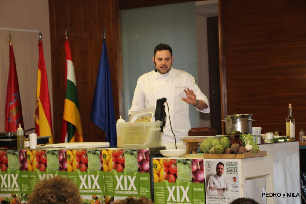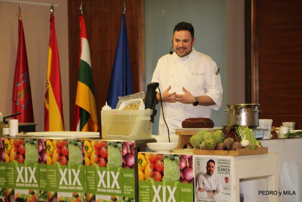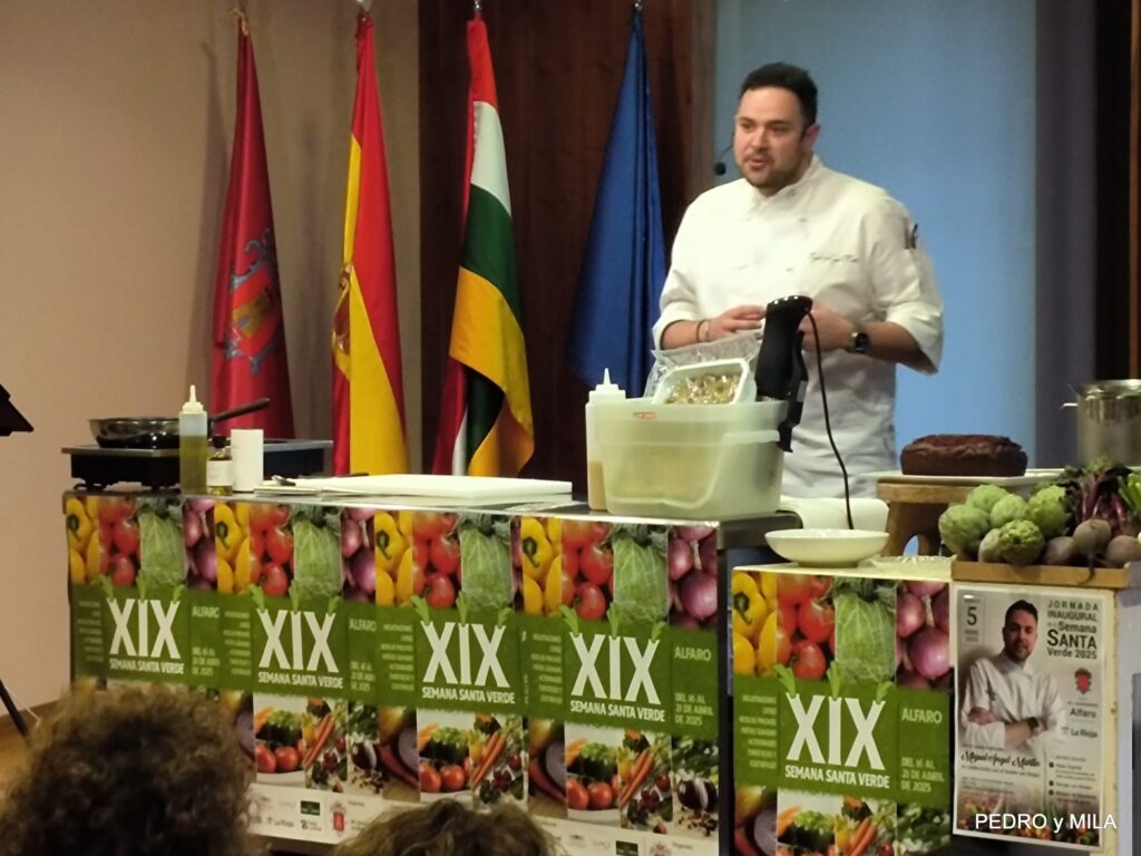 El sábado quedó inaugurada la XIX Semana Santa Verde de Alfaro. Miguel Ángel Martín, alfareño de sangre y adopción es el actual responsable de Alimentación y Bebidas e innovación de Áreas para España y Portugal, explicó tres recetas con verduras para hacer el menú en nuestra semana de la verdura 2025: Pintxo – Borrajas con Almejas – Bizcocho de remolacha con crema de queso