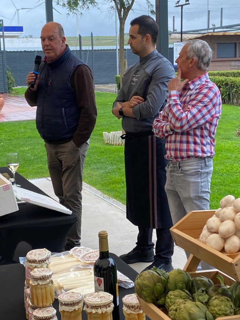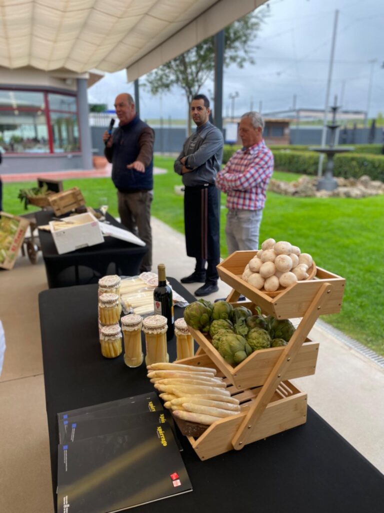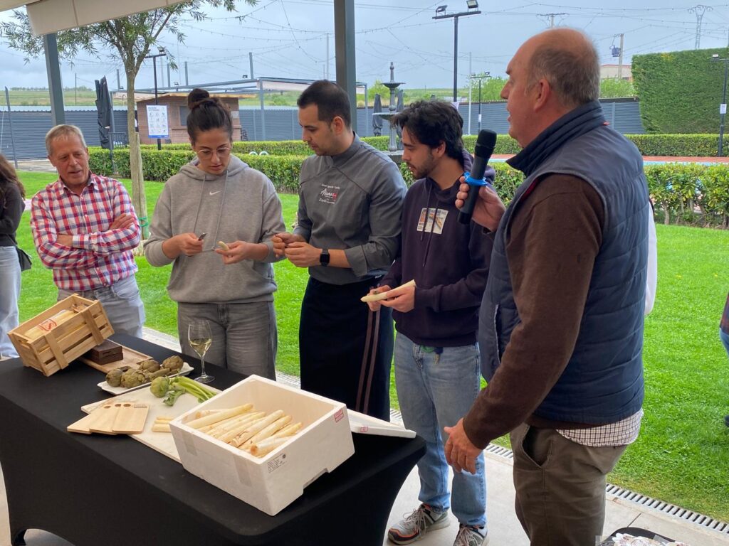 A su llegada al Zenit Calahorra, alumnos y profesores, acompañados por los vinos de la bodega institucional de La Grajera, han tenido la oportunidad de conocer la excelencia de los productos de la huerta de Calahorra, desde coliflor a alcachofas pasando por espárragos o borraja, de la mano del agricultor Jesús Pérez, quien les ha dado a conocer estas verduras que son referencia de los mercados a nivel nacional.