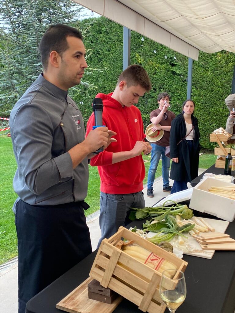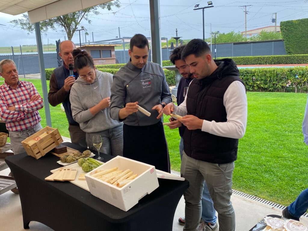 Posteriormente ha tomado la palabra el chef del Aromas de Rioja, José Ignacio Gordo, uno de los cocineros más premiados del panorama regional, quien ha explicado cómo tratar y preparar estos tesoros gastronómicos que son las verduras de la huerta calagurritana, animando a algunos de los alumnos a participar en el pelado de espárragos, alcachofas o borraja, antes de dar paso a un menú muy especial con protagonismo para la gastronomía riojana.