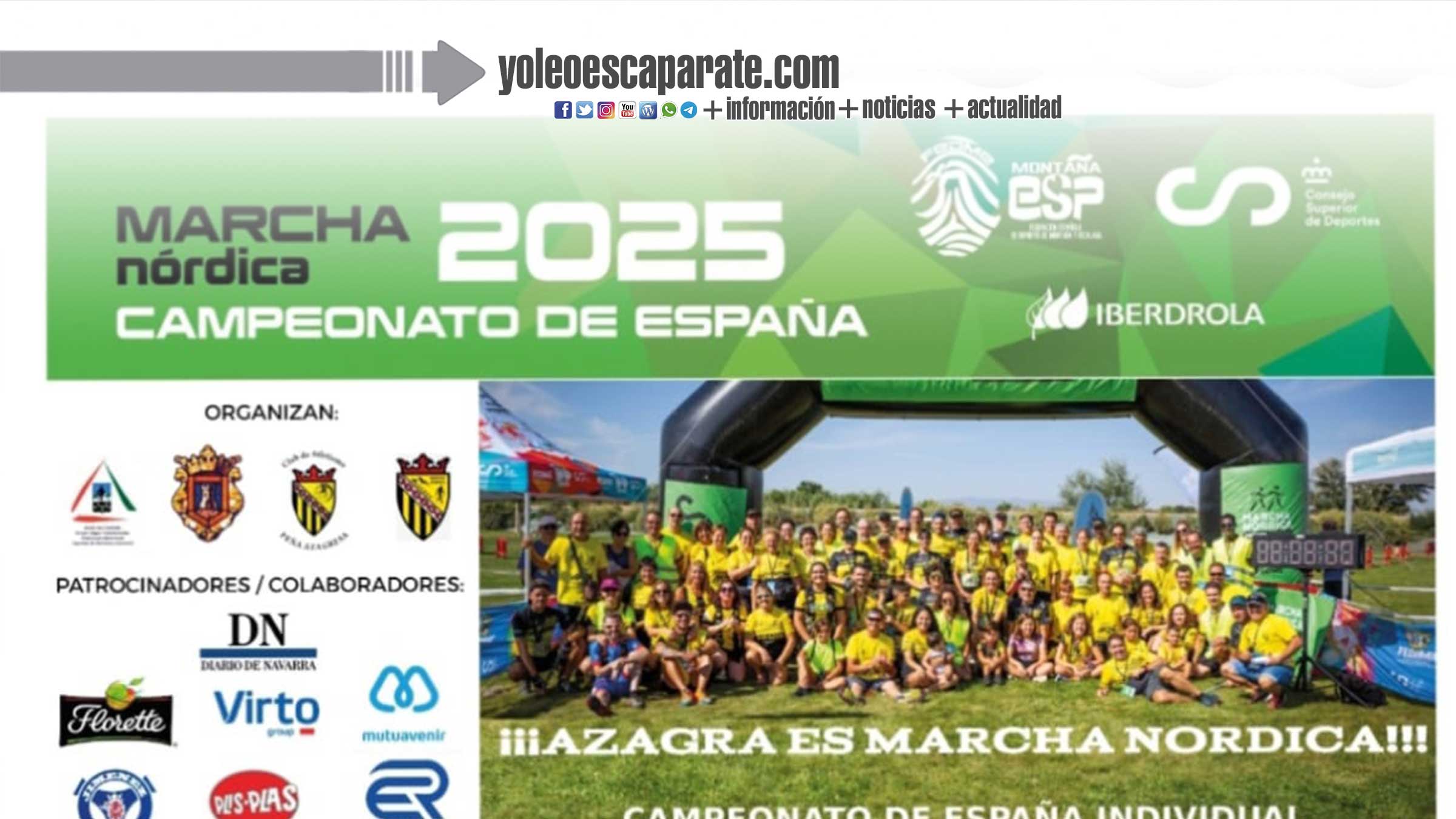 Este próximo sábado, 10 de mayo, a las 16;00 h en la zona del «Pulmón Verde» y haciendo honor a su lema «Azagra es Marcha Nórdica» , Azagra volverá a acoger el Campeonato de España individual (2ª vez que se realiza), que además será la III Prueba puntuable para la Copa de España y el VI memorial Pablo Ariza.