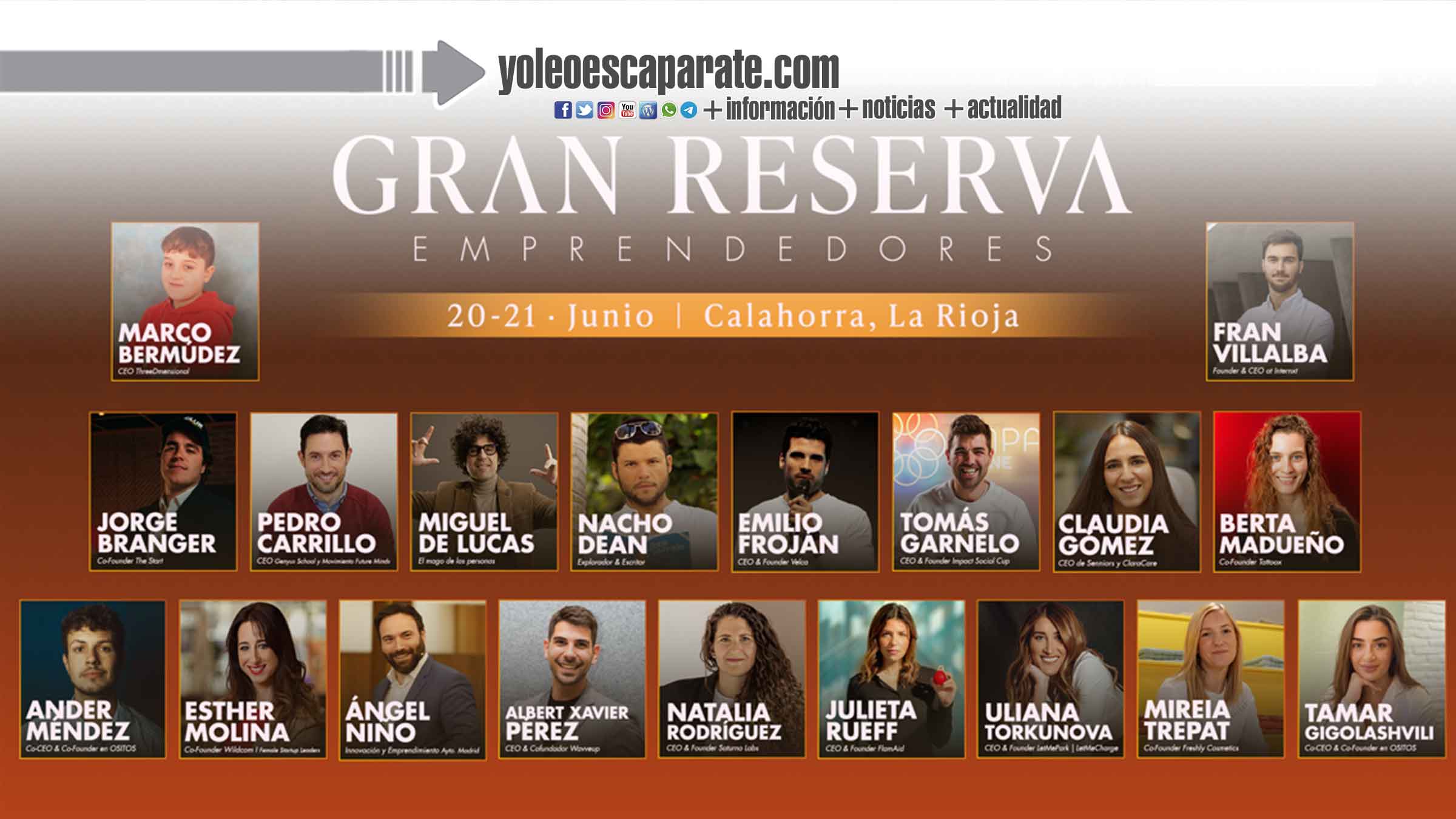 Gran Reserva Emprendedores forma parte de Gran Reserva Festival, una propuesta inédita en España que combina jornadas profesionales con conciertos en directo de artistas internacionales. Por la mañana, inspiración, ideas y networking entre fundadores, inversores y creadores; por la tarde y noche, música, cultura y celebración con artistas de primer nivel como Train, Paulina Rubio, Gente de Zona, Mikel IZAL, Chenoa, Tu Otra Bonita, Los Secretos, Alejo Stivel, Stephen Wilson Jr, y Safree, entre otros. Todo, en un entorno único como Calahorra, donde el talento se cultiva entre viñedos y se celebra al ritmo de un gran reserva.