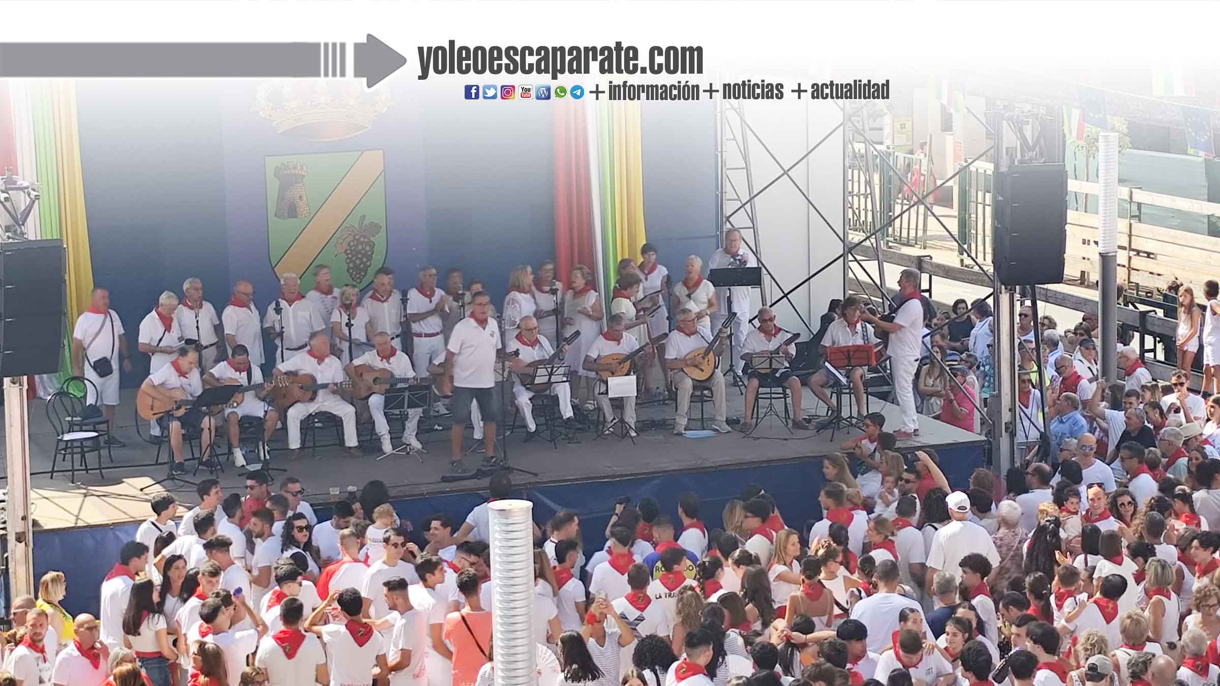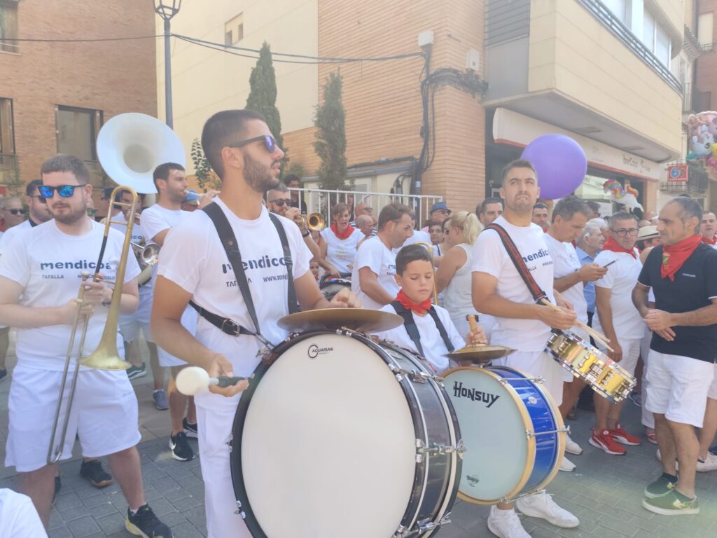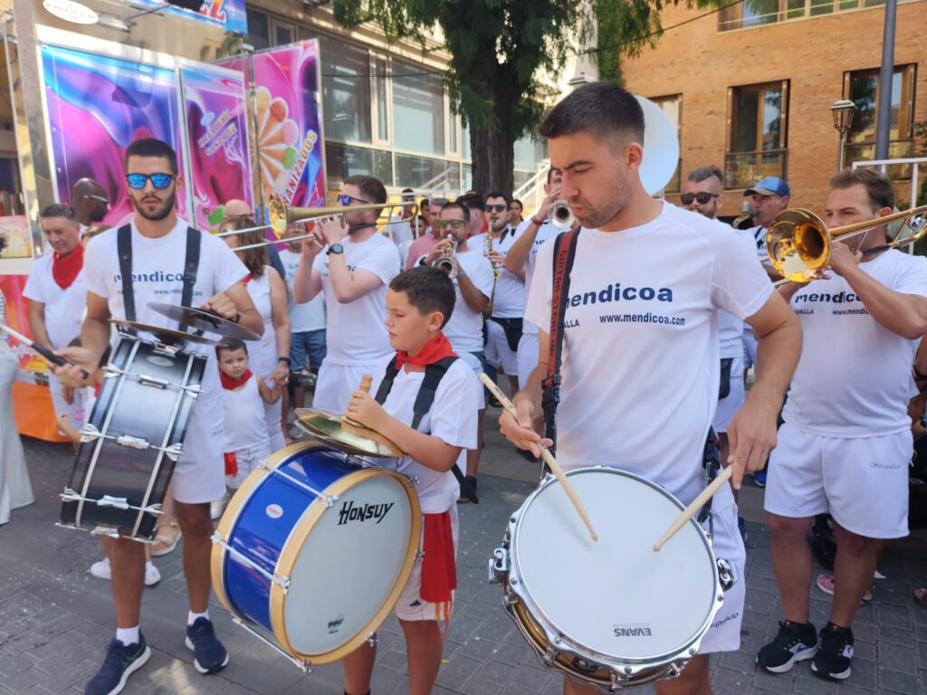 Concentración de los representantes de las fiestas, corporación y cuadrillas de Rincón de Soto para acudir a la plaza de toros, acompañados por la Charanga La Pacheca.