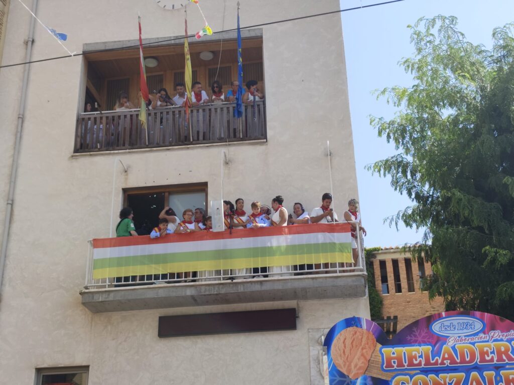 Concentración de los representantes de las fiestas, corporación y cuadrillas de Rincón de Soto para acudir a la plaza de toros, acompañados por la charanga los cachorros