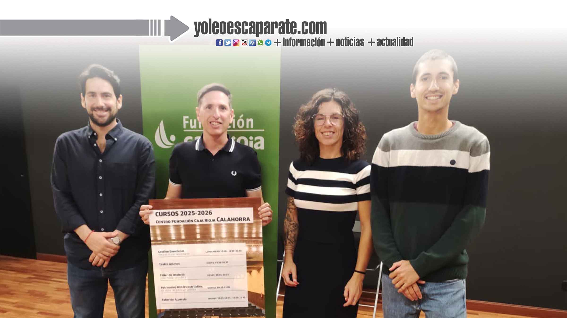 El Centro Fundación Caja Rioja Calahorra ofrece para el curso 2025-2026 una programación formativa en la que se incluyen cursos de teatro, oratoria, gestión emocional, acuarela y patrimonio riojano. Comenzarán en el mes de octubre y se prolongarán hasta mayo de 2026. Hoy ha sido presentada por la responsable del Centro Fundación Caja Rioja Calahorra, Sara Reinares, y el responsable de Formación, Víctor Iribarren, además de los profesores Javier Martínez Losa y Marcos Heras.