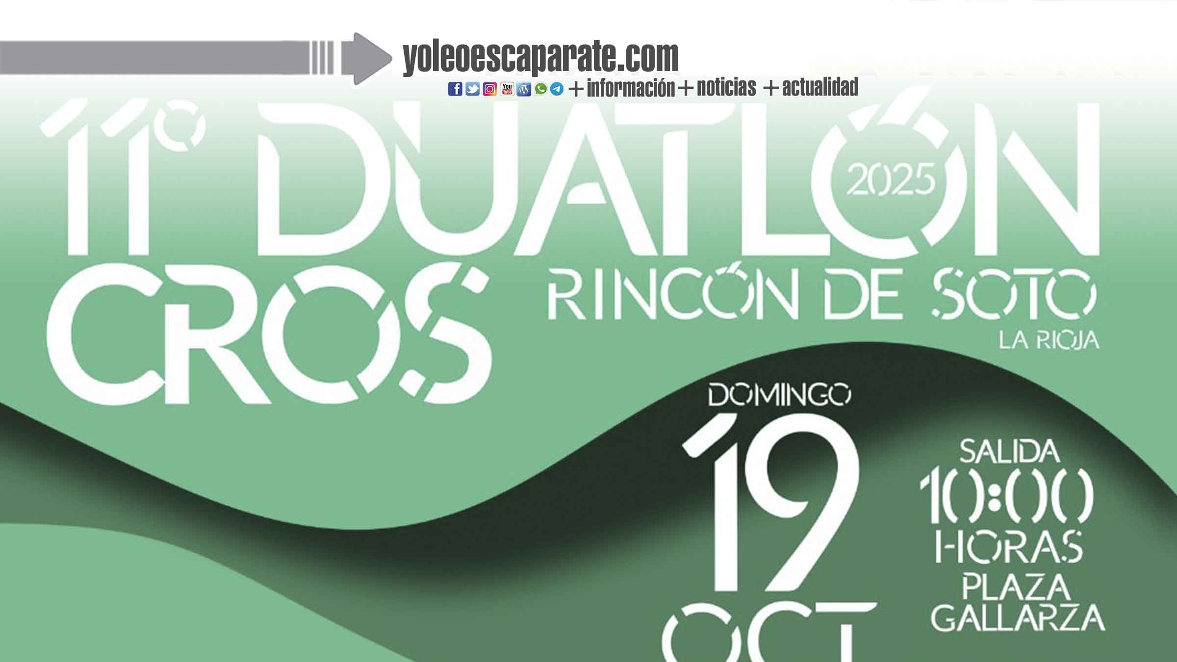 El deporte volverá a ser protagonista en Rincón de Soto (La Rioja) con la celebración del 11º Duatlón Cros, que tendrá lugar el domingo 19 de octubre de 2025. La salida será a las 10:00 horas desde la Plaza Gallarza, punto de encuentro habitual de esta cita deportiva que cada año congrega a corredores y ciclistas de la región y alrededores.