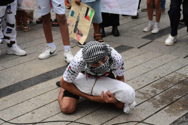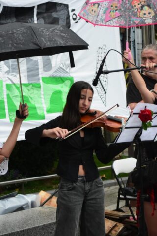 Durante el acto se realizó una performance y una joven violinista ofreció música en vivo, lo que aportó un tono artístico y emotivo a la protesta. Asimismo, se dio lectura a un manifiesto en el que se expusieron las principales demandas dirigidas a las autoridades, en un contexto que calificaron de genocidio y que, según denunciaron, se acercaba a los dos años de duración.