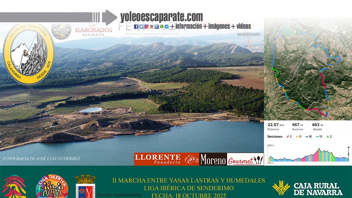 El Club de Montaña Calahorra organiza el 18 de octubre de 2025 la Segunda Edición de la MARCHA ENTRE YASAS, LASTRAS Y HUMEDALES, dentro de la LIGA IBÉRICA DE SENDERISMO INCLUIDA EN LA LIGA RIOJANA DE SENDERISMO La salida está prevista 9.00 horas desde el área recreativa del pantano del Perdiguero de Calahorra junto al Laberinto. La prueba no competitiva constará de algo más 22 kilómetros, que recorrerá lugares como La Degollada, Agudos, Pico de la Mesa y pantano del Perdiguero, pasando por caminos rodeados de Viñas que los participantes podrán disfrutar de su color otoñal. Durante el recorrido habrá 3 puestos de avituallamiento y a la llegada les esperará a las personas que hayan participado diferentes productos de la zona como tortilla, choricillo , peras, pastas, entro otros.