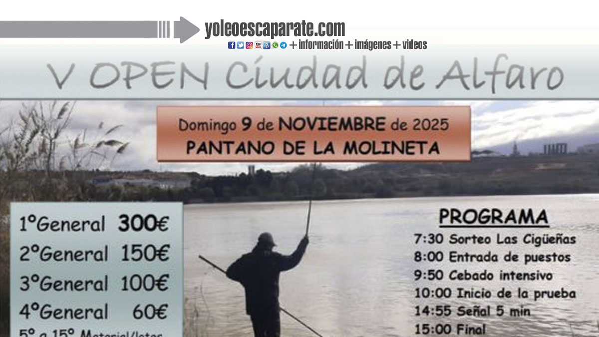 El próximo domingo 9 de noviembre de 2025, el Pantano de La Molineta acogerá el V Open Ciudad de Alfaro, una cita destacada en el calendario deportivo regional organizada por el Club de Pesca La Molineta.