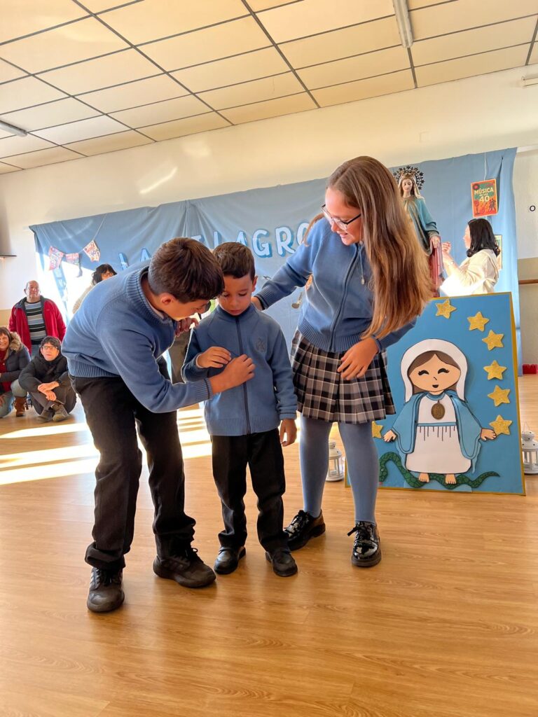 Durante el día, el alumnado ha participado en distintas propuestas organizadas en honor a la Virgen, destacando uno de los actos más entrañables: la entrega de la Medalla Milagrosa a los alumnos más pequeños (I-3), quienes la recibieron de manos de sus padrinos, los estudiantes de 6º de Educación Primaria, simbolizando así un gesto de acompañamiento y cuidado entre etapas.