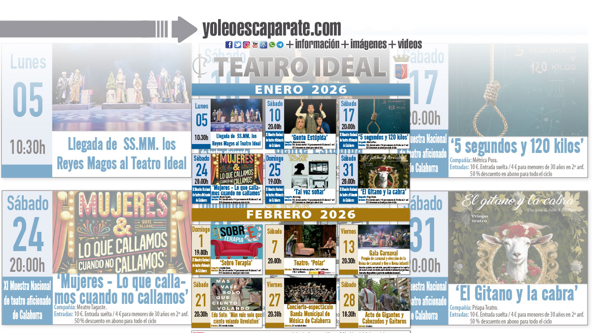 El 31 de enero a las 20:00 horas la muestra continuará con ‘El gitano y la cabra’ de la compañía Priapa teatro y el 1 de febrero el grupo A Cholón teatro cerrará esta undécima edición de la Muestra nacional de teatro aficionado de Calahorra interpretando ‘Sobre terapia’ a las 19:00 horas.