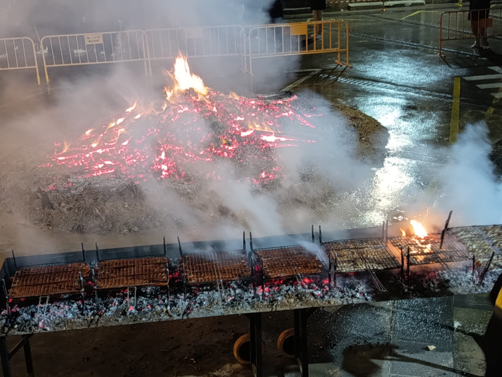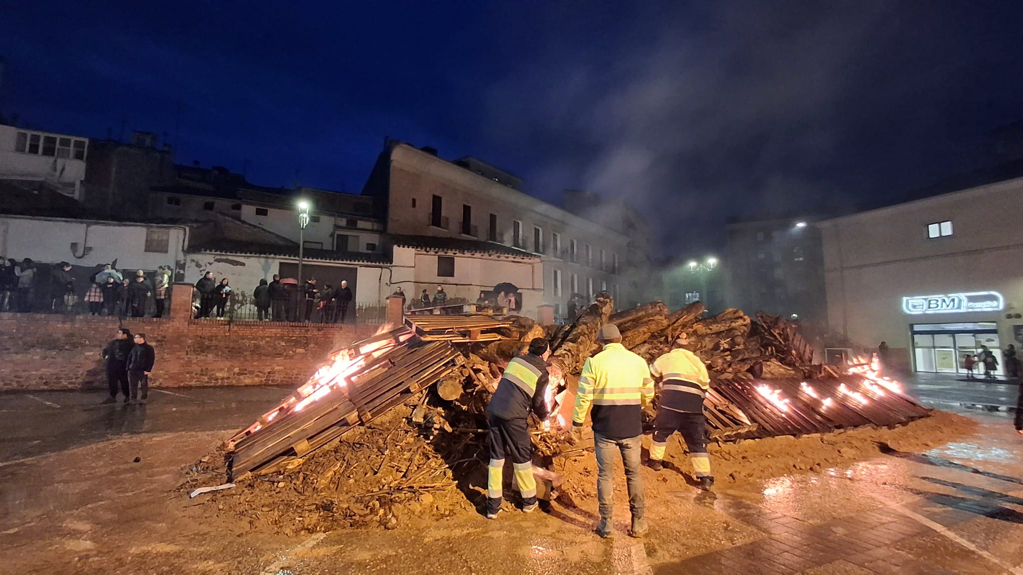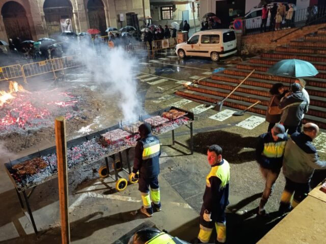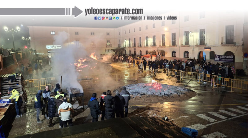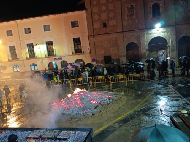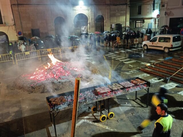 El encendido oficial de la hoguera tuvo lugar a las 18:30 horas en la Placeta San Francisco, que se convirtió en el principal punto de encuentro de la jornada. Tras el encendido, se desarrolló un reparto popular de salchicha roja, panceta y patatas asadas, en un ambiente festivo marcado por la convivencia y la participación ciudadana.