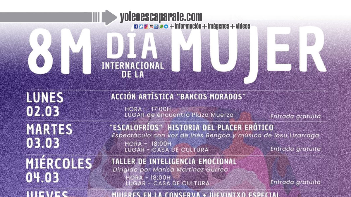 La programación arrancará el lunes 2 de marzo con la acción artística Bancos Morados en la Plaza Muerza. El martes 3, la Casa de Cultura de San Adrián acogerá el espectáculo Escalofríos, un recorrido por la historia del placer erótico con narración y música en directo.