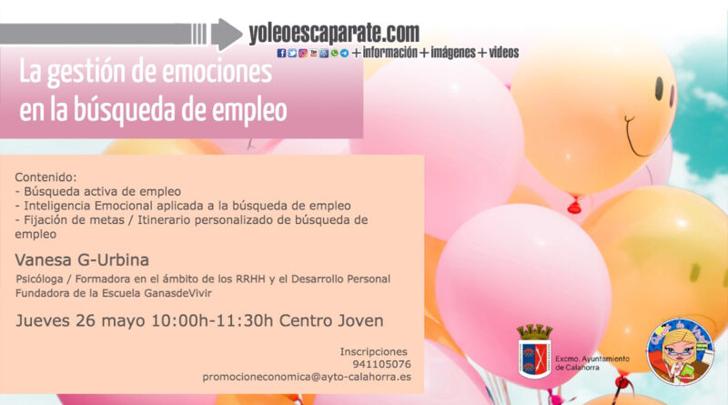 El Ayuntamiento de Calahorra, a través de la concejalía de Promoción económica y Empleo, en colaboración con la psicóloga, Vanessa G-Urbina, pondrá en marcha el próximo jueves 26 de mayo a las 10:00 horas en el Salón de Actos del Centro Joven de Calahorra la jornada “GESTIÓN DE LAS EMOCIONES EN LA BÚSQUEDA DE EMPLEO”, dirigida a todos aquellas personas que se encuentran en búsqueda activa de empleo.