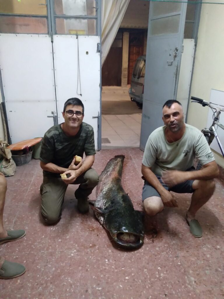 Tres riojanos, pescan un siluro de 2 metros en San Adrián