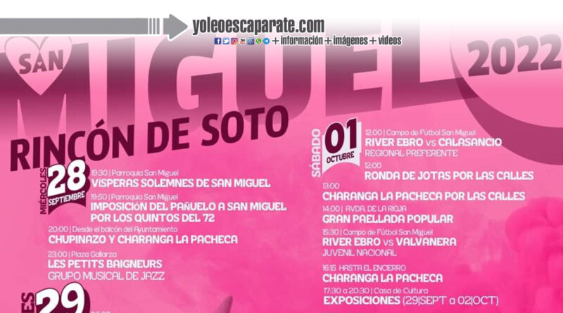 Rincón de Soto terminará el mes de septiembre con sus fiestas de San Miguel. Las fiestas comenzarán el miércoles 28 de septiembre con el tradicional chupinazo y se alargarán hasta el domingo 2 de octubre.