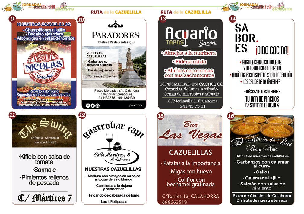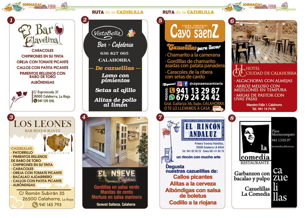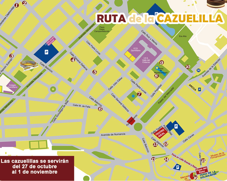 En esta ocasión, en las jornadas de la cazuelilla participarán 32 establecimientos (3 más que en el año anterior) en los que se servirán hasta tres raciones diferentes con el tradicional formato de emplatado de cazuela de barro. Las diferentes cazuelillas serán servidas entre el 27 de octubre y el 1 de noviembre, por regla general entre las 12:00 y las 15:00 y de 18:00 a 22:00. Aquí os dejamos una selección de los mejores establecimientos con mapa interactivo conectado con Google Maps . Está dividido en dos rutas diferentes por zonas que las puedes alternar en días distintos :