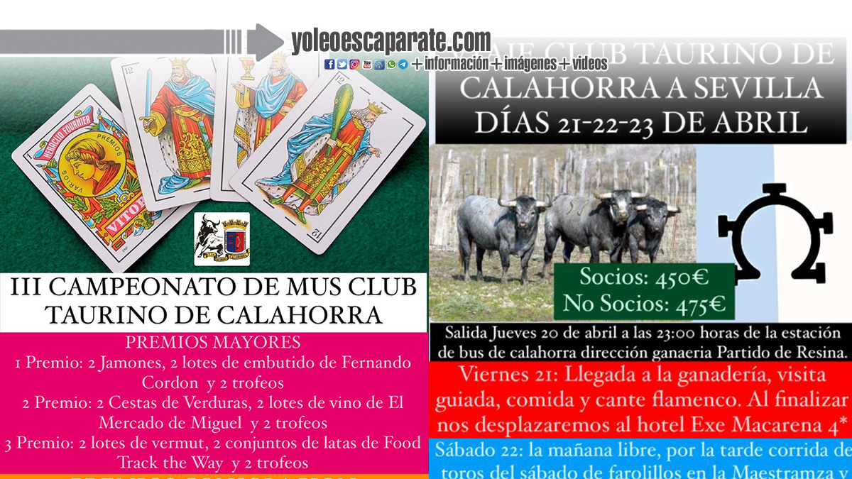 Esta tarde de 19:00 a 20:30 horas empieza la inscripción en el Club Taurino para el campeonato de Mus, el viaje a Sevilla, la venta de lotería y de merchandaising sí como de información sobre la asociación. Aquí os dejamos sus próximas actividades: